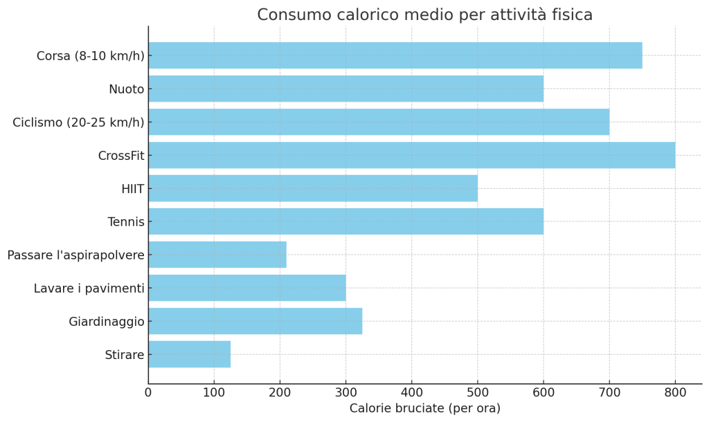 Questo grafico mostra il consumo calorico medio per un’ora di diverse attività fisiche. Come si vede, sport ad alta intensità come il CrossFit o la corsa offrono il massimo dispendio calorico, seguono poi le attività quotidiane come lavare i pavimenti o fare giardinaggio che, in mancanza di attività sportiva, possono essere un valido contributo per mantenersi attivi.